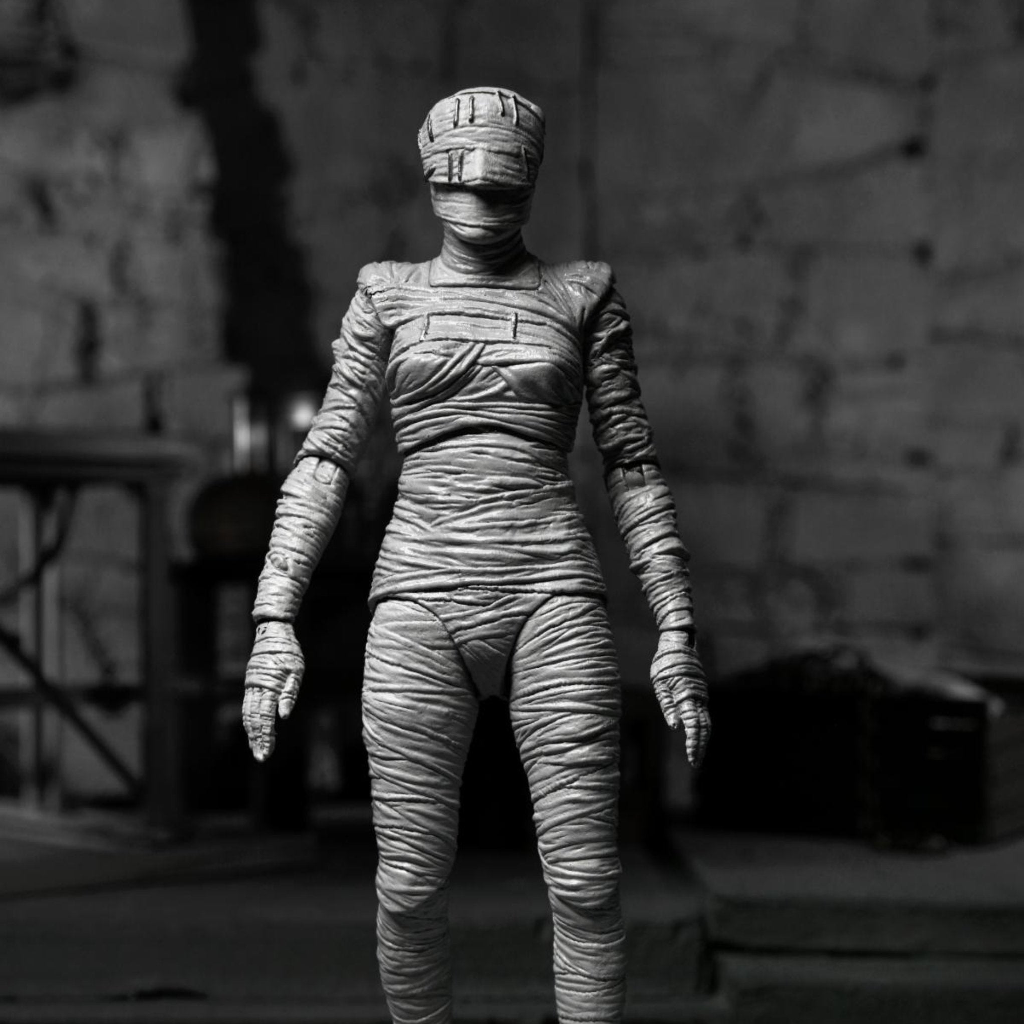 This figure is presented in movie-authentic black and white and comes with bandages, removable gown, two pairs of hands, and three interchangeable head sculpts.