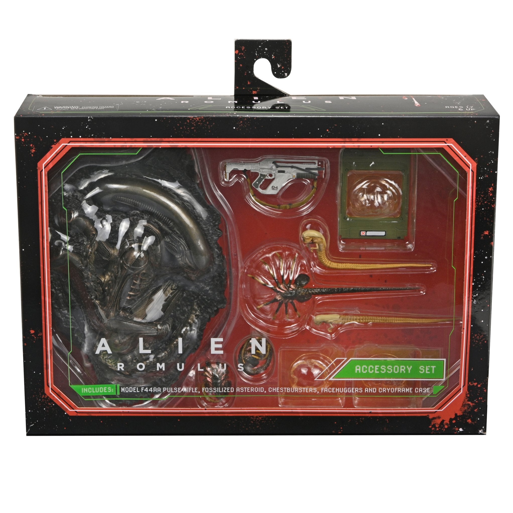 - The set comes with a model F44AA Pulse Rifle accessory (fits 7-inch scale figures), asteroid with fossilized Xenomorph XX121, facehugger and chestburster with wired tails for posing.