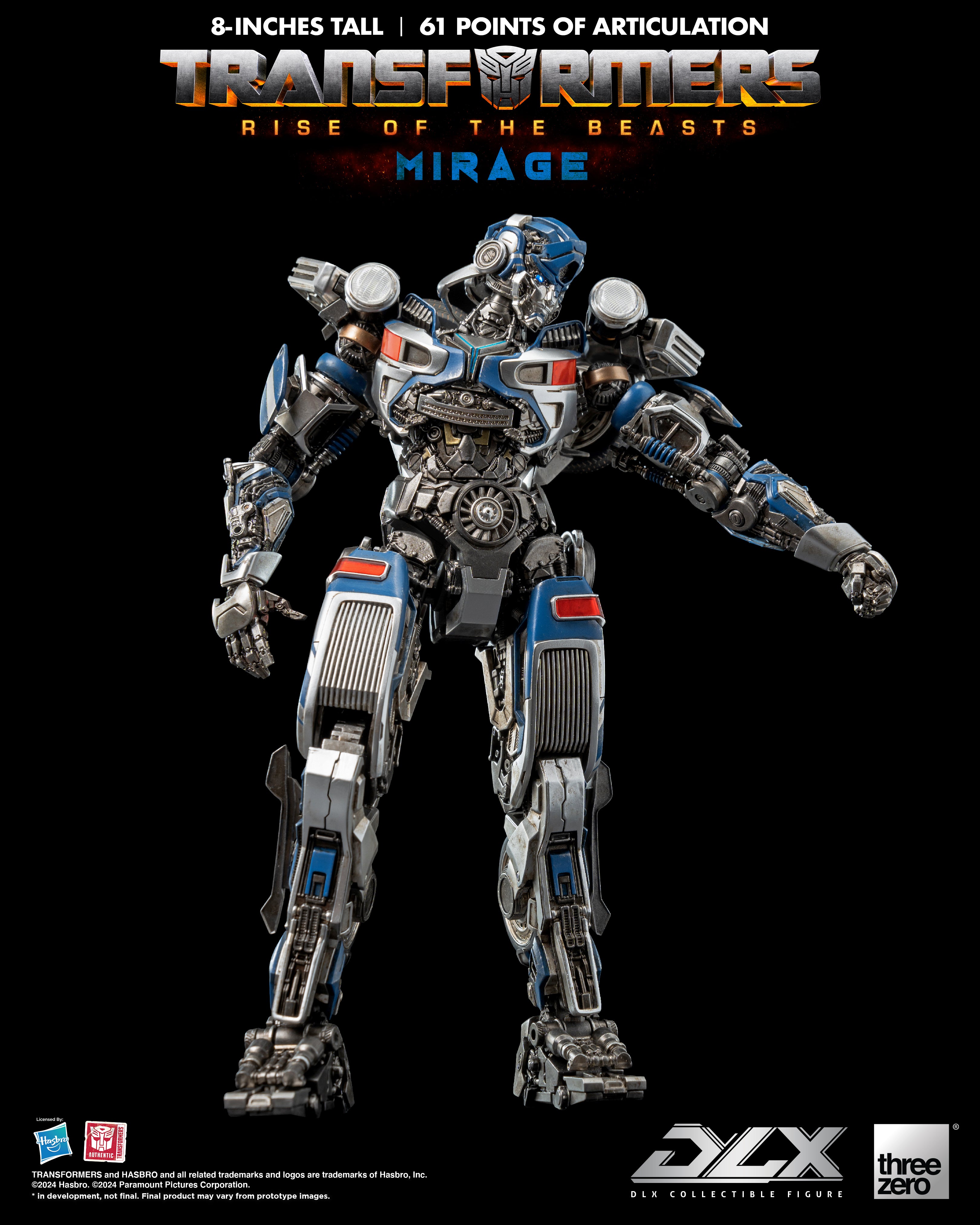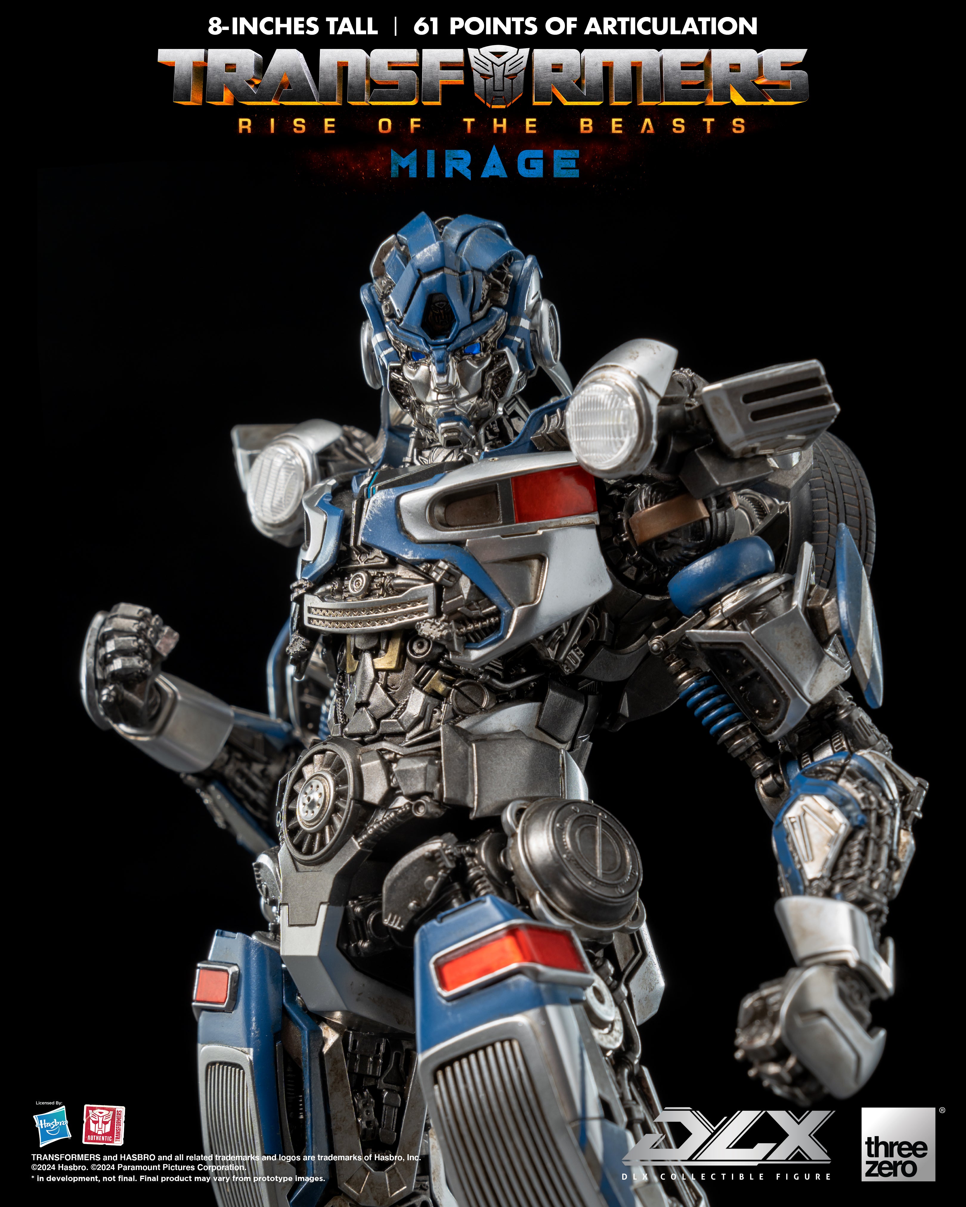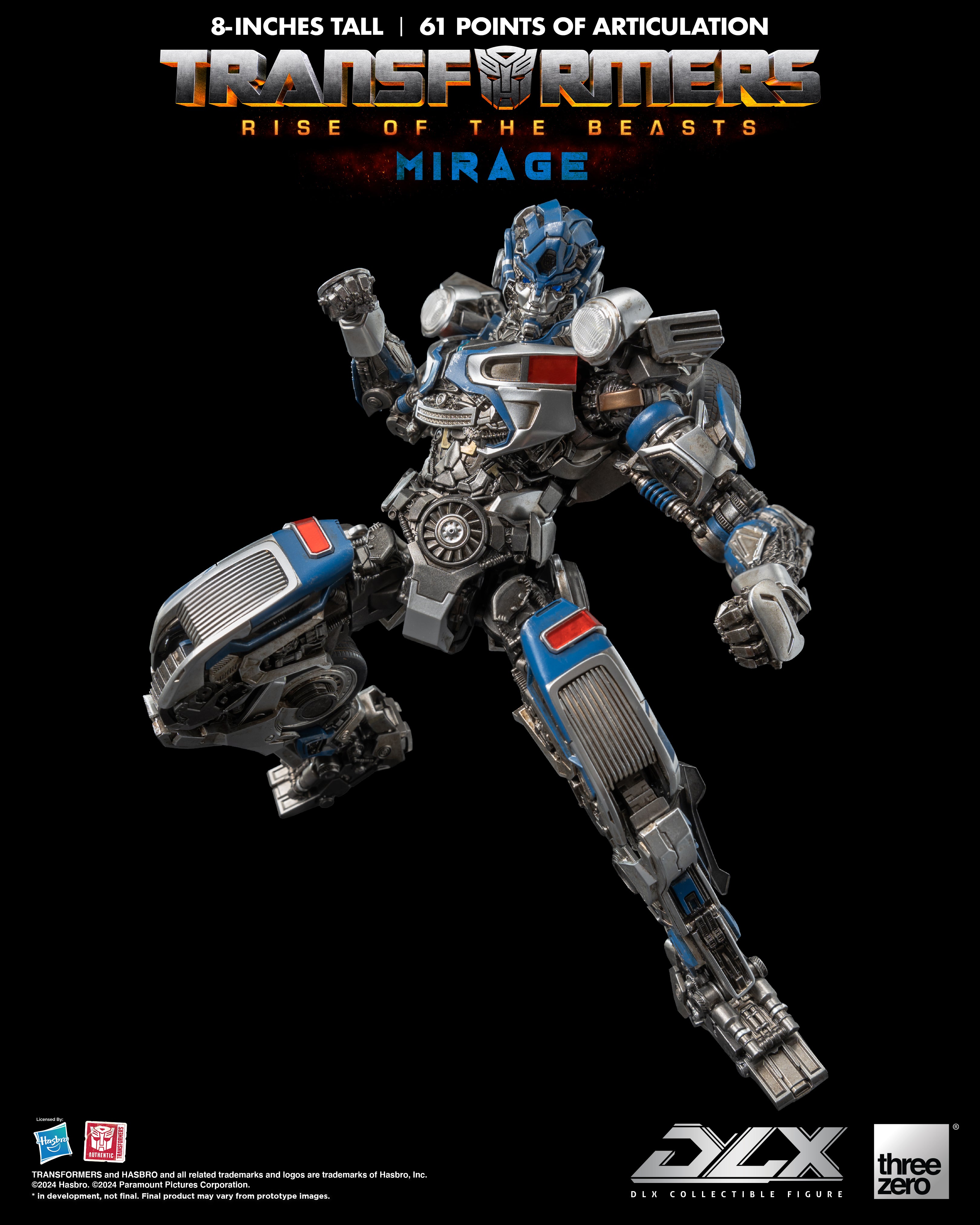 Transformers: Rise of the Beasts DLX Mirage is a highly detailed and fully-articulated collectible figure of the fast-talking Autobot Mirage. This 8' (20.32 cm) tall figure boasts engineering grade plastics with a die-cast metal frame that provides enhanced durability and an incredible range of articulation, approximately 61 points, allowing for dynamic posing and display. The weathered paint application captures the battle-worn aesthetic of this heroic Autobot.